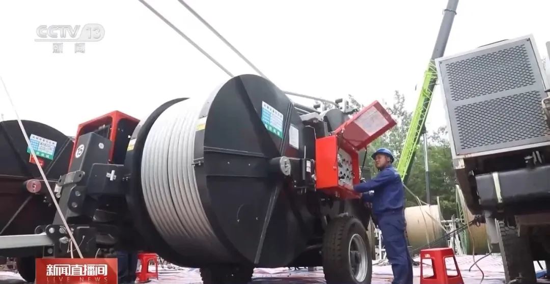 随着现场指令发出,一根重达10吨的输电导线被缓缓拉起,经过3个小时作业后,导线安全跨过1000千伏长南线,标志着继陕武线、豫阳线之后,成功完成全部三条特高压线路跨越任务。